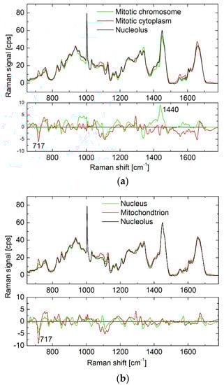 - Kuzmin, A.N.; Pliss, A.; Kachynski, A.V. Biomolecular component analysis of cultured cell nucleoli by Raman microspectrometry. J. Raman Spectrosc. 2013, 44, 198–204. [Google Scholar] [CrossRef]