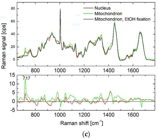 As follows from Figure 2, we formally assigned the Raman peak at 717 cm−1 to the spectra of cytoplasmic proteins. This assignment is based on the fact of the highest correlation of the peak intensity with the concentration of proteins (Figure S7). At the same time, we do not exclude that this peak can be attributed to phosphatidylcholine [], which can reach up to 44% of cytoplasmic (mitochondrion) phospholipids [].