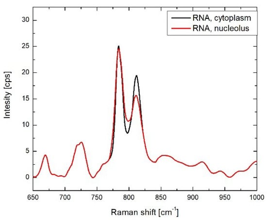 Raman spectra of cytoplasm (black) and nucleolar (red) RNA in the 650–1000 cm−1 wavenumber range used in BCAbox.
