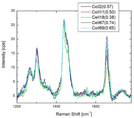 Lipids. Biomolecular component analysis indicates a significant diversity of cellular phospholipids. This diversity is mostly determined by the degree of lipid unsaturation, which can be estimated by ratio intensities of Raman peaks at 1665 and 1440 cm−1 [,]. As an example, Figure 4 demonstrates the lipid spectra of endoplasmic reticulum normalized to the peak at 1665 cm−1 for five different cells, where the saturation parameter varies from 0.35 to 0.71. Similar variations were observed for lipid spectra in different cytoplasmic locations of the same cell. Compared to the ratio of 0.58 for monounsaturated oleic acid, our data shows that cytoplasmic phospholipids in cells can contain different fractions of saturated, as well as unsaturated lipids.
