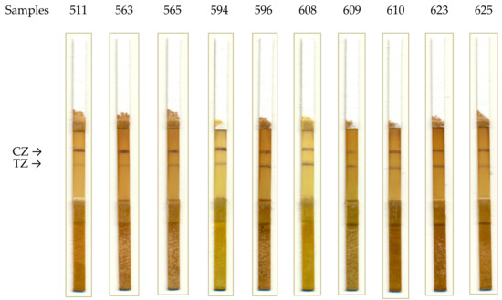 - Byzova, N.A.; Smirnova, N.I.; Zherdev, A.V.; Eremin, S.A.; Shanin, I.A.; Lei, H.-T.; Sun, Y.; Dzantiev, B.B. Rapid immunochromatographic assay for ofloxacin in animal original foodstuffs using antisera labeled by colloidal gold. Talanta 2014, 119, 125–132. [Google Scholar] [CrossRef] [PubMed]