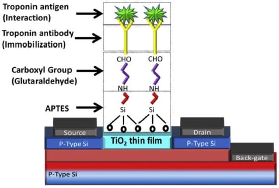 Physical adsorption is often used and relies on weak attractions such as van der Waals forces, hydrophobic interactions and hydrogen bonding to achieve antibody immobilisation []. However, such a strategy results in randomly orientated antibodies on the surface but the amount of antibody capable of binding the antigen may be sufficient to allow the generation of an adequately performing assay. Liu et al. have presented a fibre optic-based biosensor in which Bragg gratings were written into the microfiber to improve the performance of the sensor []. The functionalisation of the phase-shifted microfiber Bragg grating probe was achieved through the use of poly-l-lysine, a polyamino acid charged enhancer which generates an attraction between the surface and the Abs. This method is often the basis of immobilisation when performing ELISA using well plates. Forming covalent bonds between Ab functional groups and the substrate seems to be the most popular approach to follow with numerous groups pursuing this method. Adzhri et al. have developed a FET-based immunosensor using 3-Aminopropyltriethoxysilane (APTES) and glutaraldehyde (GA) as the linkers between the TiO2 thin film and the cAbs which can detect cTnI as low as 1 μg/L []. APTES is often used in the immobilisation strategy for FET biosensors as the chemical nature of the silica layer makes biomolecule immobilisation difficult with standard techniques []. Figure 1 provides an indication of the discussed immobilisation chemical structure used in FET biosensors. Similar variations of the same strategy are employed in several other FET biosensors targeting cTnI [,,].