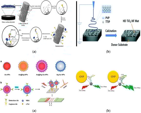 Nanomaterials are rapidly emerging as key components in the construction of sensor platforms and can be used to achieve outstanding sensitivities and contribute greatly towards the miniaturisation of sensors. They are class of materials distinguished by their size which typically ranges from 1–100 nm and exhibit properties that differ to bulk material [,]. The increasingly frequent adoption of nanomaterials is evident within several of the most recent assays and biosensors targeting cTnI, with a wide range of traditional nanomaterials being employed within these detection techniques. Nanotubes made from carbon are composed of either a single layer (single-walled carbon nanotube [SWCNT]) or multiple layers (multi-walled carbon nanotube [MWCNT]). Metals such as gold and silver are used in the synthesis of metallic nanoparticles, “highly branched polymer systems” known as dendrimers are typically less than 10 nm in size, and quantum dots (QDs) which are semiconductor-based nanocrystals display desirable optical properties beneficial in fluorescence detection systems among others [,]. Carboxylated MWCNTs are used as the foundation to create whiskered nanofibers by electrospinning, which facilitates the immobilisation of capture Abs []. In this work, shown in Figure 2a, the combination of nanofibers and carbon nanotubes aims to provide additional advantages over using one sole form of nanostructure. Noticeably, this study revolves around an electrospinning process which sees the deposition of the nanofibers directly onto the glassy carbon electrode (GCE) surface. Electrospinning is a common fabrication technique that is widely used in the construction of nanofiber-based biosensors. Using electrospinning, titanium dioxide (TiO2) nanofibers were deposited onto a silicon wafer to form a TiO2 nanofiber mat on which capture Abs could then be immobilised []. This particular approach, which is illustrated in Figure 2b, involves the transfer of the nanofiber mat using polydimethylsiloxane (PDMS) offering a unique solution to avoid damaging the nanofiber mat due to its brittle composition and was capable of detecting cTnI at concentrations as low as 4.4 ng/L.