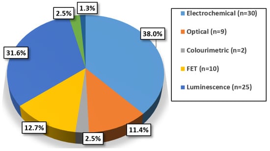 Assessing the composition and characteristics of the reviewed techniques can assist in identifying trends relating to the most common approaches undertaken and the inherent suitability towards POC integration of these techniques. Certain performance characteristics for each sensor and assay were recorded with particular attention paid towards some of the most relevant criteria in terms of POC integration. Furthermore, as these detection techniques have not been clinically trialed, the precision of each has not been disclosed, hence for the purpose of this review this aspect will not be considered. It is evident from Figure 3 that electrochemical detection methods are the most often used for emerging cTnI assays and biosensors. These typically involve the use of GCEs or screen-printed electrodes (SPEs) and the implementation of an electrochemical technique such as EIS, cyclic voltammetry (CV) or differential pulse voltammetry (DPV). Electrochemical detection is an appealing option, particularly for POCT, as it is easily miniaturised, often is label-free and requires less costly instrumentation than other approaches [,].