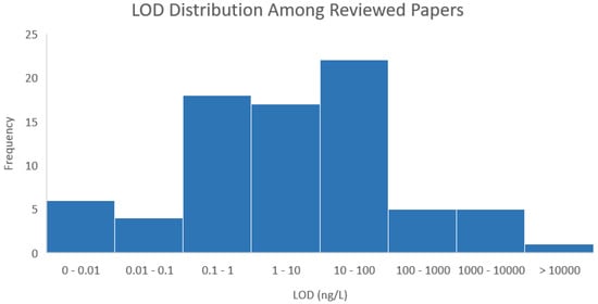 LOD of reviewed papers. Data for the 77 reviewed papers was collected and the assays and biosensors are arranged into subsets based on the LOD. The qualitative colourimetric technique was excluded.