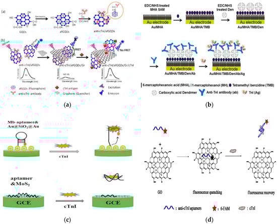 Label-free and novel labelling techniques [,,,]. (a) Detection process scheme for graphene quenching of afGQD fluorophores and subsequent release of Ab upon cTnI binding; (b) Fabrication scheme of a ‘label-free’ electrochemical-based biosensor; (c) Electrochemical detection technique utilising a core–shell immobilisation surface and alternative ‘label-free’ detection technique utilising MoS2 nanosheets for cTnI measurements; (d) 6-FAM-modified aptamer dislodged from graphene oxide sheets in the presence of cTnI. (All figures have been re-printed with permission from the publisher).