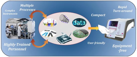 Many of the techniques that have already been reviewed encompass only the detection of cTnI, excluding the practical challenges that will face POC integration. POCT must be user-friendly, eliminating the need for highly trained personnel and assisting in promoting the adoption of this technology on a broader sense within healthcare services, particularly in primary care. Fundamental to the design of a POC platform is automation. Loading the sample into the POC device should initiate the sensing procedure and may require mechanical assistance in the form of actuators and also relies on fluid manipulation mechanisms. Furthermore, there are several additional key aspects that link into the engineering design of a POC system, such as sample delivery or cartridge design, electronic circuitry, software development, signal processing and data management. Many of the challenges identified are often encountered during the development of an in vitro diagnostic platform and the specific approach undertaken for each device is highly dependent upon the pre-defined set of design constraints. However, additional demands arise during the development a POC platform due to the need to adhere to recommended POCT criteria. Several of these requirements have been previously mentioned, with other recommendations advocating the use of robust and safe reagents and consumables, that the platform is independent of complex equipment that may be required in sample pre-treatment and the test results are consistent with an established laboratory method []. Furthermore, the design of a POC platform will inherently dictate its conformance for large-scale production and the cost effectiveness of the individual test. However, at present, the ambiguous nature of evaluating the economic consequence of POCT compared to laboratory analysis has somewhat restricted its widespread implementation []. Figure 6 depicts the transition from a laboratory-based assay to a POC platform, indicating several elements that are often key in the fabrication and operation of a POC device.