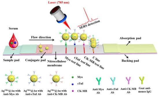 - Zhang, D.; Huang, L.; Liu, B.; Ni, H.; Sun, L.; Su, E.; Chen, H.; Gu, Z.; Zhao, X. Quantitative and ultrasensitive detection of multiplex cardiac biomarkers in lateral flow assay with core-shell SERS nanotags. Biosens. Bioelectron. 2018, 106, 204–211. [Google Scholar] [CrossRef] [PubMed]