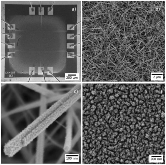 Tungsten oxide (non-modified nanowires), cerium oxide (non-modified porous films), and cerium oxide-tungsten oxide core-shell nanowires were grown directly onto micromachined transducing platforms (Figure 2a) [18] using the AACVD system described previously [19]. AACVD is a variant of the conventional CVD technique, which uses aerosol to transport dissolved precursors to a heated reaction zone. Here, the non-modified tungsten oxide nanowires films were deposited at 350 °C from a solution of tungsten hexacarbonyl (30 mg, W(CO)6, Sigma-Aldrich, St. Louis, MO, USA, ≥97%) and methanol (5 mL Sigma-Aldrich, ≥99.6%), whereas the non-modified cerium oxide films were deposited at 500 °C from cerium (III) acetylacetonate hydrate (28 mg, Ce (acac)3·×H2O, Sigma-Aldrich) dissolved in methanol (2 ml, Sigma-Aldrich). On the other hand, the cerium oxide-tungsten oxide core-shell nanowires were achieved using a two-step AACVD process [20], in which the tungsten oxide nanowire cores were deposited at 350 °C in the first step and the cerium oxide shell film at 500 °C in the second step employing the same protocols described above for the non-modified films. Finally, the non-modified and modified films were annealed at 500 °C in air.
