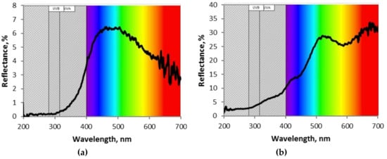 The diffuse reflectance spectra of the aerosol assisted chemical vapor deposited (a) tungsten oxide and (b) cerium oxide films without modification.