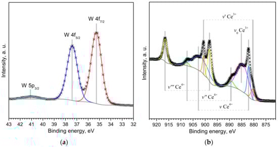 (a) The W 4f and (b) Ce 3d spectra recorded on the cerium-modified wires. The W 4f spectrum recorded on the non-modified tungsten oxide wires showed similar characteristics.