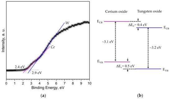 Linear extrapolation of the valence band (VB) leading edge on the XPS spectra recorded on the Ce/W film near the Fermi level (EB = 0) indicates the simultaneous presence of both cerium oxide and tungsten oxide induced VB (Figure 6a). One can notice that the VB onset for cerium oxide occurs ~0.5 eV (ΔEV) above the VB onset for tungsten oxide. Therefore, according to the band gap estimated by diffuse reflectance for each non-modified material in the position of the conduction band (CB) of cerium oxide is ~0.4 eV (ΔEC) above the CB of tungsten oxide, consequently suggesting a staggered type of heterojunction at the interface of the Ce/W core-shell structures (Figure 6b). In contrast, the linear extrapolation of VB leading edge on the XPS spectra of the W and Ce films showed only the presence of tungsten oxide induced VB at 2.9 eV in agreement with previous reports [13].
