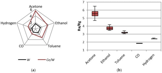 (a) The radial plot of the sensor response to 80 ppm of acetone, ethanol, toluene, carbon monoxide, and hydrogen using the W and Ce/W based sensors. (b) Box plots of the sensor response to each analyte recorded by the Ce/W based sensors. Each box displays the median and upper and lower quartiles (first and third) of the respective distribution. Box whiskers indicate the dispersion of the measurements.