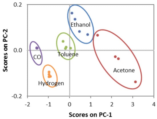 Figure 7a displays the sensor response to 80 ppm of each analyte and type of sensor at 300 °C. These results show the improved responses registered for the Ce/W sensors, as opposed to the W sensors, as well as the higher responses to acetone compared to the rest of the analytes. Results in Figure 7a also suggests an improved selectivity for the Ce/W films with lower cross-responses among the analytes; for instance, the difference of the response to acetone in relation to ethanol is 1.6 for the Ce/W films and 1 for the W films. The low cross response registered on the Ce/W sensor is noticed in more detail in Figure 7b, in which is displayed the analysis of variance (ANOVA) realized for a data set comprising four replicates for each type of sensor and analyte. Additionally, the principal component (PC) analysis performed using replicated responses of both sensors (i.e., W and Ce/W) to each analyte is represented in Figure 8. These results, specifically the scores, which correspond to the projections of the measurements in an orthogonal base of PCs, indicate the possibility to improve the discrimination of the analytes by using an array of W and Ce/W based sensors.