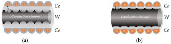 The enhanced functionality recorded on the Ce/W sensors is connected with the formation of heterojunctions at the interface of the tungsten oxide wires and the cerium oxide porous films. These heterojunctions are present due to the different band energies in both MOXs (Figure 6b), which facilitate electron migration from the cerium oxide film to the tungsten oxide wire. Generally, as oxygen is preadsorbed at the sensitive film during air exposure, the surface depletion region (LD) and, in turn, the conduction channel along the wires are narrowed, which leads to lower conductivity along the film (Figure 11a). Alternatively, when a reducing analyte (i.e., VOCs) reacts with the preadsorbed oxygen, electrons are released back to the conduction band, and the depth of the surface depletion is narrowed, increasing the conduction channel along the wire and, in turn, its conductivity (Figure 11b). This mechanism controlled by the pre-adsorbed oxygen is similar for the non-modified and modified films, with the peculiarity that the charge transfer process (electron migration) occurring at the junction of the cerium oxide film and tungsten oxide wire provides larger electron density to the wires (accumulation layer) in the pre-adsorption cycle (as opposed to the non-modified W or Ce films). This allows for larger changes of the depletion layer and an enhanced modulation of the wire conduction channel, which is reflected finally on the sensor response.