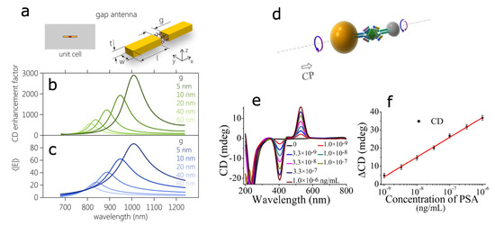 Stronger effect has been predicted for plasmonic “hotspots”, located within the gaps of dimer nanoantennas for both resonant and off-resonant CD signals [27,28,29,30]. The enhancement factors as high as 3000 could be expected for the gap size of 5 nm. The CD enhancement factor correlates with averaged electric field in the gap, as indicated by Figure 2a–c [31].