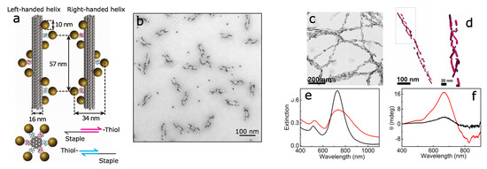 One of the common approaches for arranging plasmonic nanoparticles in a chiral fashion is by using DNA molecules [51,52,53,54,55] (see Figure 3). Various types of DNA-based chiroplasmonic nanostructures have been covered in recent review [56]. Besides, promising results have been achieved using peptide-directed assembly of gold nanoparticles into single-helix [57,58] and double-helix superstructures [59].