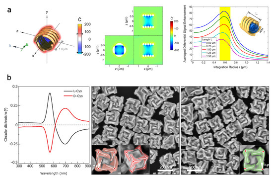 3D chiral plasmonic nanostructures: (a) simulated four-helix gold nanostructure showing strongly confined optical chirality within the helices (left, middle) and the graph presenting the enhancement of differential absorption signal depending on the radius of integration, for different length of a structure (right). Adapted with permission from Schaferling et al. [76] Copyright 2014 American Chemical Society. (b) Three-dimensional plasmonic helicoids controlled by cysteine chirality transfer: CD spectra and SEM images of chiral nanoparticles synthesized using L-Cys and D-Cys. The insets highlight the tilted edges (solid lines), cubic outline (dashed lines) and tilt angles ( and ). Reproduced with permission from Lee et al. [77] Copyright 2018 Springer Nature.