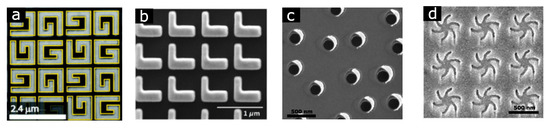 Examples of planar chiral nanostructures: (a) arrays of G-shaped gold nanoparticles. Adapted with permission from Valev et al. [89] Copyright 2009 American Chemical Society. (b) Arrays of L-shaped gold nanoparticles. Adapted with permission from Ye et al. [91] Copyright 2017 American Physical Society. (c) Short-ordered arrays of comma-shaped gold nanoparticles [94]. (d) Gold metafilm with arrays of “Shuriken” nanostructures. Adapted with permission from Kelly et al. [98] Copyright 2018 American Chemical Society.