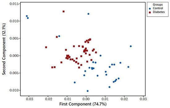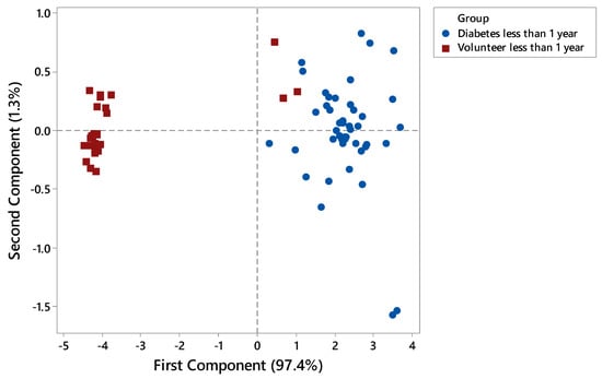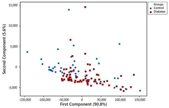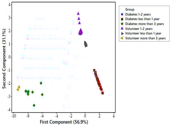 PCA analysis was used for classification of the features that were extracted by dividing the maximum resistance by the baseline resistance. Plotting only the first and second PCA components shows the disease classification has been affected by the urine sample’s storage age. Figure 9 illustrates the diabetes and control samples collected 4 years prior to analysis, for which the classification is not performed appropriately. Figure 10 shows the classification for diabetes and control samples collected and tested in less than 18 months. The results show that newer samples are tightly clustered and sufficiently separated from the disease class in comparison to the group of older samples.