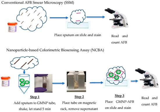 Schematic representation of sputum smear microscopy (SSM) (top) and nanoparticle-based colorimetric biosensing assay (NCBA) (bottom) approaches.