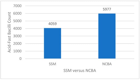 Based on the optimization results (Table 1 and Table 2), the optimized treatment was 0.4% NaOH/4% NALC in a 1:1 ratio and 10 mg/mL of GMNP. Figure 2 shows that by using the optimized parameters, the AFB count for SSM was 4059 and NCBA was 5977, increasing NCBA by 47%, showing the extraction and concentration effect. The clinical relevance of this result is that an AFB count below 5000 in SSM would be considered a paucibacillary case and would likely lead to a false negative result in conventional settings, increasing the risk of TB transmission. With NCBA, the AFB count is close to 6000, increasing the chance of a positive result and getting treatment, thus minimizing transmission while increasing TB control.