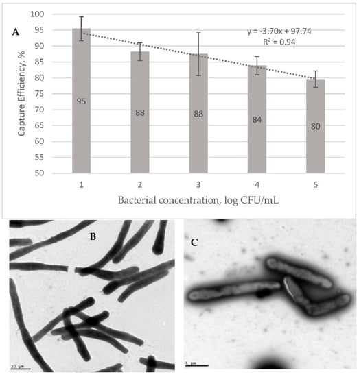 Figure 4A shows the capture efficiency (CE) of the GMNP in different concentrations of Msm. These were prepared in artificial sputum, magnetically extracted and plated on a MiddleBrook 7H10-ADC agar. The data shows that the CE decreases linearly with increasing bacterial concentration, from 95% at 101 CFU/mL to 80% at 105 CFU/mL. This result supports the sputum data in Table 3, where 1+ samples transform to 2+ using NCBA, since a lower bacterial concentration would result in a higher CE. Figure 4 also shows TEM images of corded Msm without GMNP (B) and with GMNP (C).