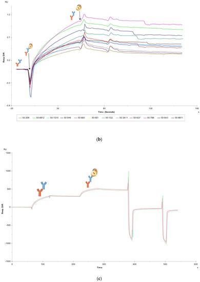 - Canziani, G.A.; Klakamp, S.; Myszka, D.G. Kinetic screening of antibodies from crude hybridoma samples using Biacore. Anal. Biochem. 2004, 325, 301–307. [Google Scholar] [CrossRef]