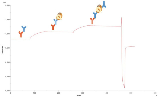 SPR based sandwich pairing. Sensorgram depicting crude “good” sandwich pair F-50-6B12 + F-50-6B12. The first curve in the sensorgram represents the hazelnut binding to F-50-6B12. The following curve shows the binding of a second F-50-6B12 to the hazelnut protein extract.