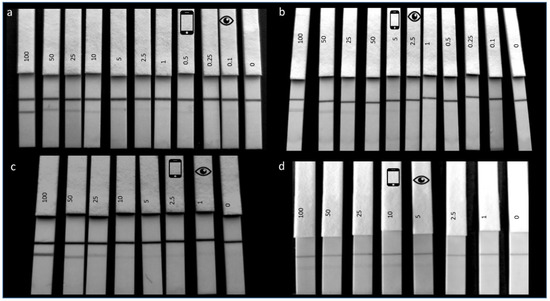 Lateral flow immunoassay limit of detection experiments. (a), F-50-6B12, (b), S-50-5H9: LFIAs showing the LOD determination of hazelnut protein extract spiked in PBS in the range of 100 ppm to 0.1 ppm with the last LFIA being a blank (0 ppm). In all LFIAs, the upper line is the control line and the lower line the test line. The visual LOD is indicated by the eye icon and the detection limit using a smartphone camera is indicated by the smartphone icon. (c), F-50-6B12, (d), S-50-5H9: LFIAs showing matrix LOD of hazelnut protein extract spiked in blank cookie extract (1:100 in running buffer) in the range of 100 ppm to 1 ppm (with the last strip representing a blank 0 ppm). The visual LOD is indicated by the eye icon and the detection limit using a smartphone camera is indicated by the smartphone icon.