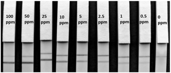 F- 50-6B12 Lateral flow immunoassay matrix limit of detection. Lateral flow strips for F-50-6B12 showing the matrix LOD of hazelnut protein extract spiked in blank cookie using 50 µL spiked sample and 50 µL RB. A clear LOD of below 0.5 ppm can be visualized both with the naked eye and with a smartphone camera.