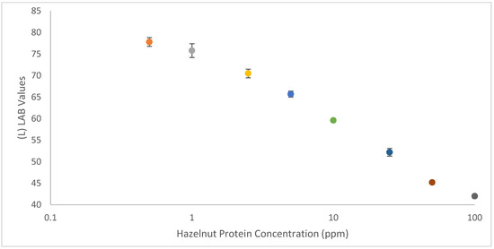 A calibration curve showing the relationship between (L)LAB values of test lines of hazelnut LFIA in a decreasing concentration of hazelnut protein (in blank cookie). Error bars have been included to show the standard deviation across multiple (n = 3) measurements. An (L)LAB value of 100, (0, 0) corresponds to a true white and of 0 (0,0) to a true black, in this study the lowest L value was 42 and so the L (LAB) axis begins at 40.