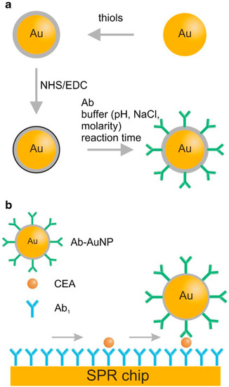 A crucial part of a biosensor is the receptor. The receptor must ensure that only the target marker is captured from the analyzed sample, as well as ensuring suitable effectiveness in terms of the strength of analytical signal sufficient for the determination of a marker in real samples. In the reviewed papers, appropriate antibodies were most frequently used as receptors. The antibody was attached to the gold chip surface via a linker. Most frequently, cysteamine (2-aminoethanethiol) was used as the linker. Cysteamine is fixed onto the gold surface by the thiol group, while the amine group is used for attachment of the antibody. An example of such receptor immobilization is shown in Figure 4.