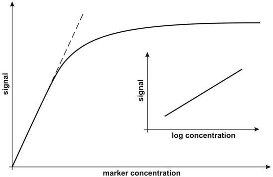 As regards calibration strategy, all calibration graphs represent the Langmuirian curve type, in which the initial sections may approximately follow the strain lines, while the whole curve may be approximately linear when the analytical signal is plotted against log marker concentration. Almost all of the reviewed papers containing calibration data report calibration on the basis of a linear calibration graph, although semi-logarithmic curves were also used.