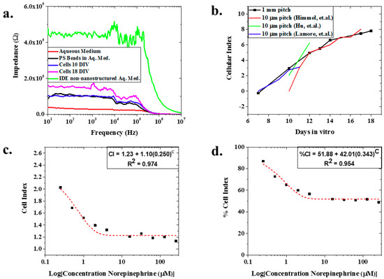 (a) Representative full spectrum impedance measurements—the nIDEs with cardiomyocytes cultured on them show an increased impedance from the nIDEs that only have an aqueous medium. In addition, as the cells proliferate, an increase in impedance is observed; (b) Variation of the Cellular Index (CI) of the cells cultured on the nIDEs for 18 days: it was observed that the CI of the nIDEs increased over time as expected because the cell coverage of the nIDE increased over time. The calculated mean value of N = 8 wells of nIDEs is represented by the square bullet point. A comparison to the data from Himmel et al. tracks the CI changes observed in our assay. Since our IDE pitch is 100 times the pitch demonstrated by the IDE from Himmel, we believe the presence of the nanostructures results in improvement in device sensitivity; (c) CI and (d) %CI for norepinephrine experiment: Mean values for N = 7 is depicted with a square bullet point. The CI and %CI both show an exponential decrease, with excellent fits given by their R2 values of 0.974 and 0.954, respectively, as the concentration of norepinephrine increased because the cells were dying due to the dosage of the drug. This caused a departure from the impedance of the nIDE with no norepinephrine added.