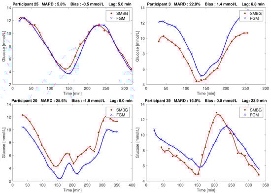 In these sessions the participants were non-fasting and used their regular insulin regime and sugary drinks or meals to manipulate their glucose level. The collected glucose responses typically had three flanks (i.e., up/down/up, or down/up/down) with approx. 5 / as the lower turning point and approx. 10 / as the upper turning point, respectively. The overall range of glucose in our dataset as measured by SMBG was 3 / to 26 /. Four representative examples of the SMBG and FGM data resulting from these sessions are shown in Figure 1.