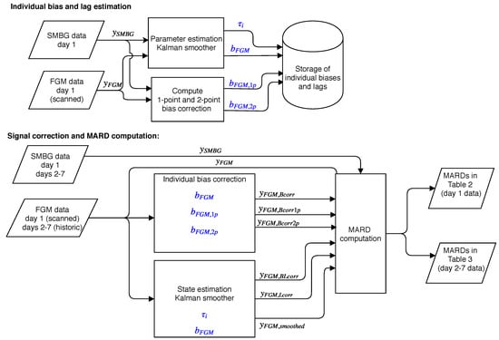 The bias and lag estimates computed by the Kalman smoother are accurate because of the many points used. Basing a real-time bias estimation on this method is not practical due to the many SMBG measurements required. In a practical bias calibration, only one or two data points per day should be used, as in normal CGM calibration regimes. We therefore also computed a 1-point bias correction, finding a bias based on the error in the first paired data point from each day 1 session. Correcting for this bias produces a signal . We also computed a 2-point bias based on the mean of the errors in the first and last paired point from each session, producing the signal . The different biases were used to correct data from day 1 and days 2–7. A block diagram providing an overview of the method we employed is shown in Figure 2.
