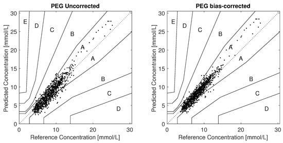Parkes/Consensus Error Grid plots. Left: Uncorrected Right: Bias corrected Bias correction per individual makes 91.2% of the paired points lie in zone A.