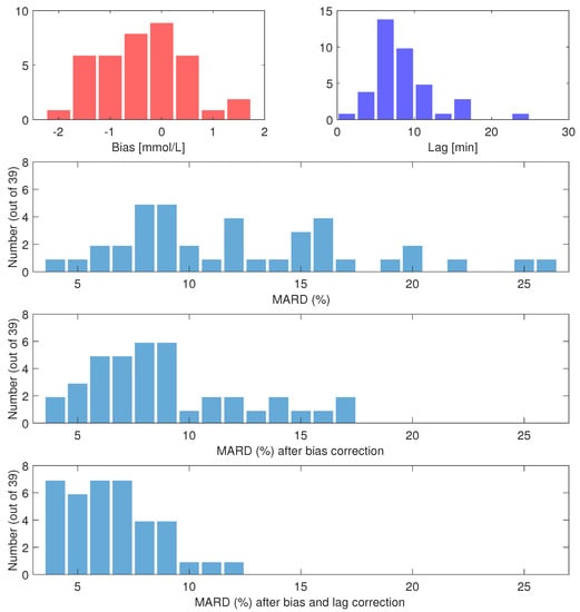 There were on average 27 paired measurements per individual. Individual participant MARDs varied between 4.0% and 25.5%. A total of 18 participants had MARD <10%, however five had MARD ≥ 20%. Biases varied between −1.8 /, and +1.4 /, with a mean of −0.4 /. Time constants ranged from 2 to 24 , with a mean of 9 . Histograms of individual MARDs, biases and lags on day 1 are shown in Figure 4. The most extreme cases of bias and lag are shown as time series in Figure 1. Other effects besides bias and lag are seen in some sets, e.g., overestimation in periods of high glucose (data not shown).