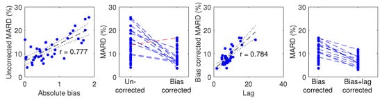 If the data are corrected for the biases found, the overall MARD on day 1 falls significantly (p < ) from 12.3% to 9.2%. The participant with the largest MARD (25.5%) got a MARD of 6.4% with bias correction. The maximal individual MARD after bias correction is 17%. Of the 39 participants, 27 got a MARD below 10% after bias correction. For nine participants, the bias correction led to an increase in MARD, with one participant getting an increase of more than 3 percentage points. The MARD after bias correction is well correlated with the estimated lag; see Figure 5.