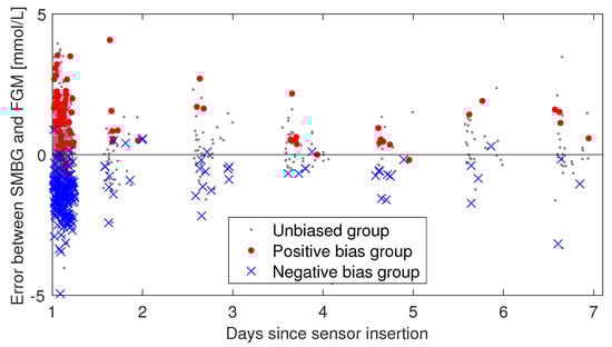 Persistence of bias in days 2–7. The individual sensor errors (SMBG–FGM) are plotted against time and colored according to what bias group the participant was in at day 1. If the bias observed in day 1 is not persistent, one would expect the blue and red data points to start mixing as time progresses. The day 1 session is included in this plot, but the analysis of bias persistence considered data from days 2–7 separately from day 1 data.
