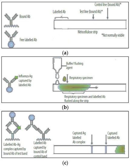 RIDT mode of action: (a) Bounding dye-labeled antibodies specific for target antigen onto the nitrocellulose strip; (b) Addition of respiratory specimen with buffer to the strip; (c) Trapping antibodies on the test line if target antigen is presented. Reproduced with permission from WHO on behalf of the Special Programme for Research and Training in Tropical Diseases, Use of Influenza Rapid Diagnostic Tests; published by WHO Library Cataloguing-in-Publication Data, 2010.