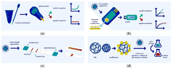 Different approaches for influenza virus detection: (a) Reuse of known devices like glucometers; (b) Electrical detection system; (c) Strip-based sensor/ ELISA modifications; (d) Optical approaches using nanoparticles.