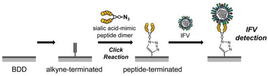 An example of electrode surface modification. Boron-doped diamond electrode modified via click reaction for infectious flacherie virus (IFV) electrochemical detection. Reproduced with permission from Matsubara et al., PNAS; published by PNAS, 2016.