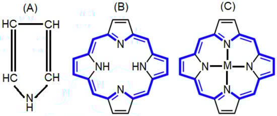 Typical structures, i.e., (A) pyrrole, and (B) porphyrin consist of four pyrrole rings joined by methene bridges, and (C) metalloporphyrin (M = Fe, Mn, Cr).