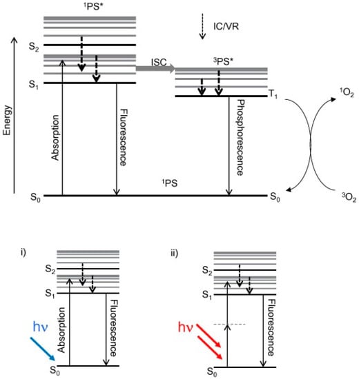 A simplified Jablonski diagram showing typical energy levels and transitions relevant to the formation of the triplet state of the photosensitizer and photosensitization of molecular oxygen. IC = internal conversion, VR = vibrational relaxation, ISC = intersystem crossing. Reproduced from McKenzie et al. [32], with permission from Elsevier.