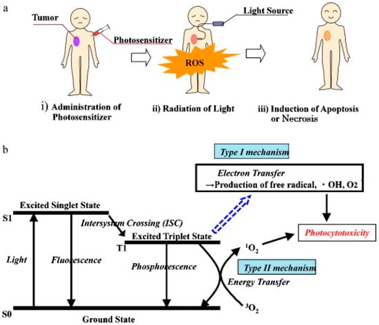 PDT mechanism: (a) profile of PDT treatment; (b) generation of excited states and reactive oxygen species (ROS). Reproduced from Yano et al. [62], with permission from Elsevier.