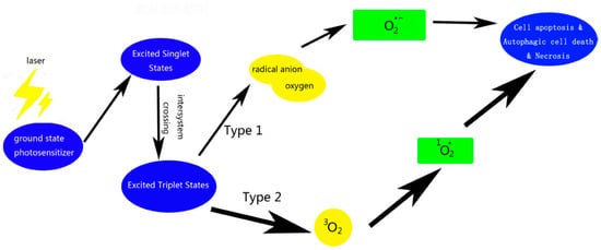 The general profile of PDT treatment is shown in Figure 6 [62]. In conventional PDT procedure, an appropriate dose of the photosensitizer is injected into the bloodstream of a patient. After a suitable time, the photosensitizer which accumulates in malignant cells is followed by irradiation with light of definite wavelength, a red light or the light with wavelength 550–800 nm is suitable for PDT of deeper tumor tissue. The light below 500 nm is not ideal for deeper tumor tissue. Photodynamic activity is initiated by the absorption of a photon by photosensitizer and followed by various radiative and non-radiative processes and may result in degradation or oxidation of biomolecules [62]. Molecular oxygen present in the tissue plays a vital role in the propagation of molecular damage resulting in tissue destruction and cell death. Hence, the photodynamic therapy induces cell necrosis by generating ROS. There are two types of photodynamic reactions: type I and type II. In type I processes, the excited state of the photosensitizer generally acts as photo-oxidant, oxidizing cellular substances, i.e., biomolecules like amino acid and DNA bases to form radicals or radical ions [62,63]. In type II process, as a result of interaction between electronically excited photosensitizer which is in triplet state with the molecular oxygen (3O2) yields highly active singlet oxygen (1O2) which react with many biological molecules including lipid, proteins, and DNA leading to cancer cells [29,63,64]. The transfer of energy from excited state to PS to oxygen and generation of singlet oxygen (1O2) is very efficient [29,65]. All the steps involved in the generation of ROS as shown in Figure 7 [66], except the generation of biomolecule-based radicals, and excited state of the photosensitizer will oxidize a biomolecule rather than oxygen to form superoxide.