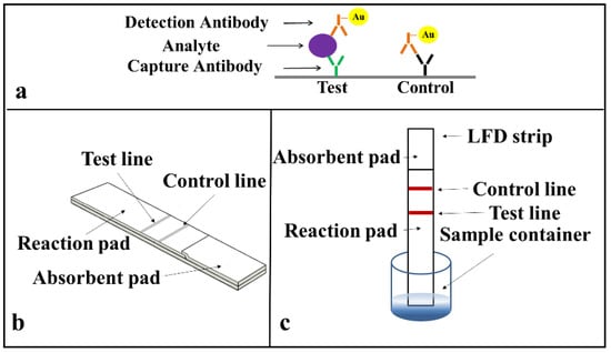 Multiplexing, which is defined as simultaneous analysis of multiple analytes under the same set of conditions, is a critical parameter for increasing diagnostic efficiency [15]. An obvious example of such a need is in clinical diagnosis, where multiple analytes which are inter-dependent need to be detected and quantified to allow informed decisions to be made concerning the progression or stage of a particular disease [16]. In recent years, therefore, there has been an increasing demand for POC multiplexed diagnostic assays. The strategies that enable such simultaneous analysis of multiple analytes are largely based on the use of the following underlying diagnostic techniques, i.e., 96-well microtiter plate-based enzyme linked immunosorbent assays (ELISA) [17], real-time polymerase chain reactions (PCR) [18,19], and microarrays or bead-based methods [20,21]. Although all these methods could enable high-throughput and low volume processing, they require expensive non-portable equipment and trained personnel for their operation. Consequently, LFDs are regarded as one of the most competitive candidates for POC settings, due to their unique advantages that have been described earlier.