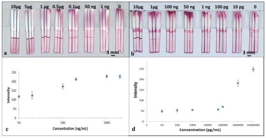 The images captured using the scanner were processed with the ImageJ software (National Institutes of Health, Bethesda, MD, USA) to extract the respective colour intensities of the red colour produced at the test lines. The resultant plot in Figure 4c shows the relationship between the respective test-line colour intensities for each of the individual devices and the corresponding concentrations for the samples used to test each of the devices.